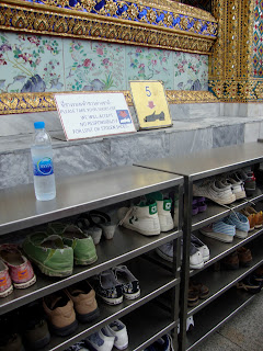 We quickly changed (since your legs must be covered to at least your knees before entering the temples and you aren’t allowed to wear sandals) and went on our way. We arrived at the Grand Palace first and walked around. It was gorgeous. Everything here is gorgeous. The buildings are so ornate, elaborate and filled with so much detail and gold. It’s amazing. The Grand Palace is an area of many buildings and used to be home to the King, until he moved his residence to Chitralada Palace. Inside the Grand Palace is the Temple of the Emerald Buddha, otherwise known as Wat Phra Kaew, which was built in 1782 as the Monarch’s personal place of worship (http://en.wikipedia.org/wiki/Grand_Palace). In order to see the Emerald Buddha, or inside the majority of the buildings you are required to take your shoes off, so there were all these racks and cubbies outside the buildings for you to put your shoes. It was quite interesting.